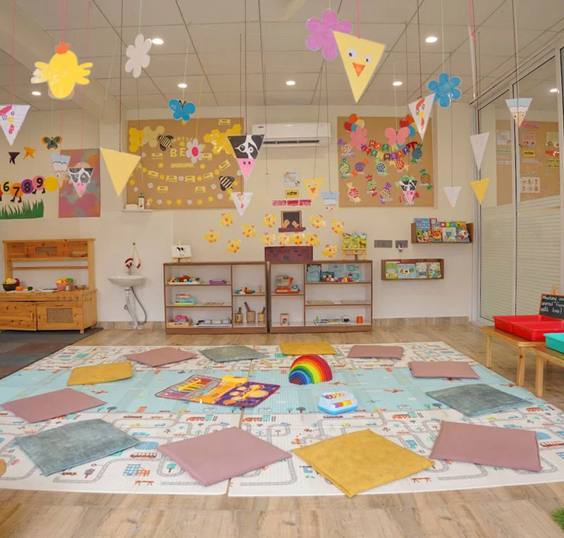 Toddlers are welcomed into a theme-based decorated classroom with creative art works hanging. The natural sunlight in the toddlers classroom make them feel at home. Welcome & free play is designed for children to setlle down in the class.